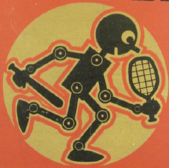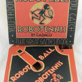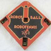 Der erste Blechspielzeug Roboter ist bekanntlich der Lilliput Robot. Er erschien 1937. Ein Jahr vorher, nämlich 1936, kam das seltene "Robot Ball - Robotennis" Spiel in die Geschäfte. Robot Ball war eines der ersten Gesellschaftspiele der ein Jahr vorher gegründeten US-amerikanischern Firma Cadaco Ltd. Cadaco fertigte bis vor wenigen Jahren eine Breite Palette von Gesellschaftsspielen, ist aber vor allem für ihre Baseballspiele bekannt. Die Spielfläche für die beiden Spiele ist gut 30 x 30cm groß. Anscheinend mußte man einen Gummiball in eine der Vorrichtungen werfen, der "Roboter" warf dann den Ball zurück, den man auffangen sollte. Interessant ist die frühe Darstellung eines Roboters.
